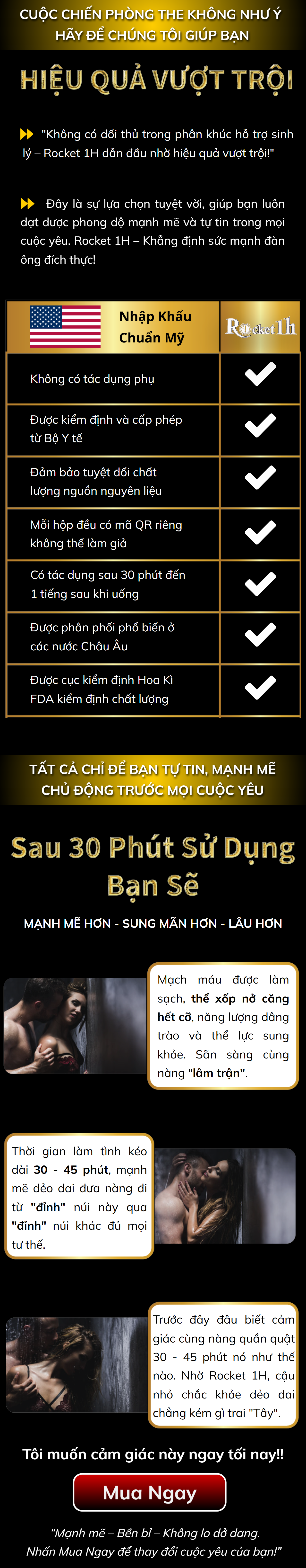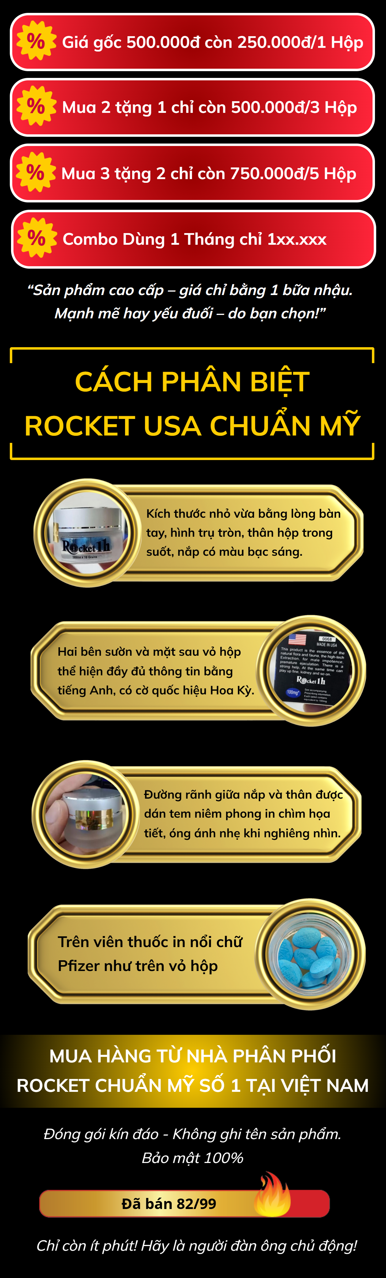 – Rocket 1H là sản phẩm hỗ trợ sinh lý nam giới giúp tăng cường sinh lực và cải thiện chất lượng cuộc sống chăn gối.